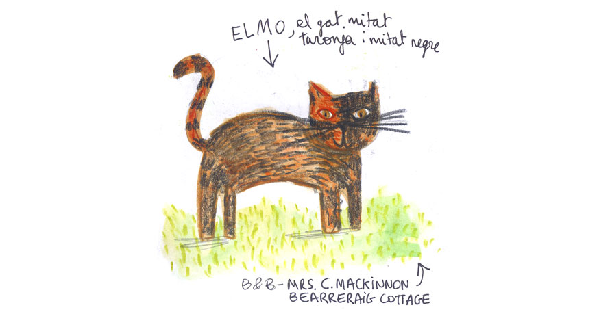 Il·lustració de l’Elmo, el gat abandonat mig taronja i mig negre que visita el B&B dels srs. Mackinnon a Storr Lochs, Portree, Ille Skye, Escòcia.