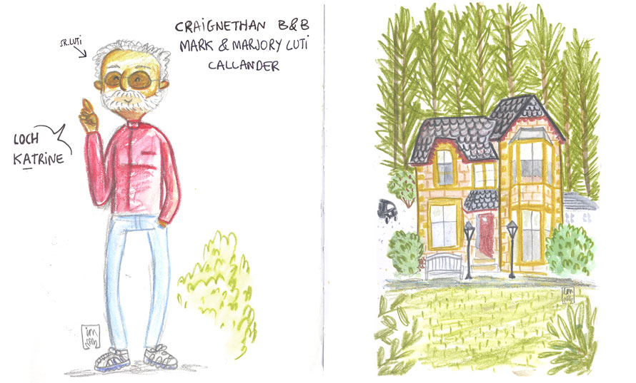 Il·lustració del sr. Luti i el seu B&B a Callander, Perthshire, Escòcia.