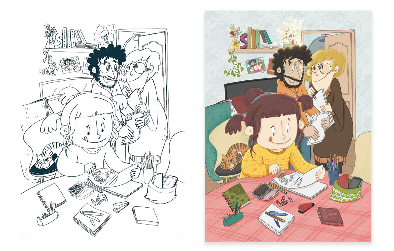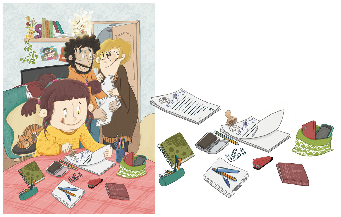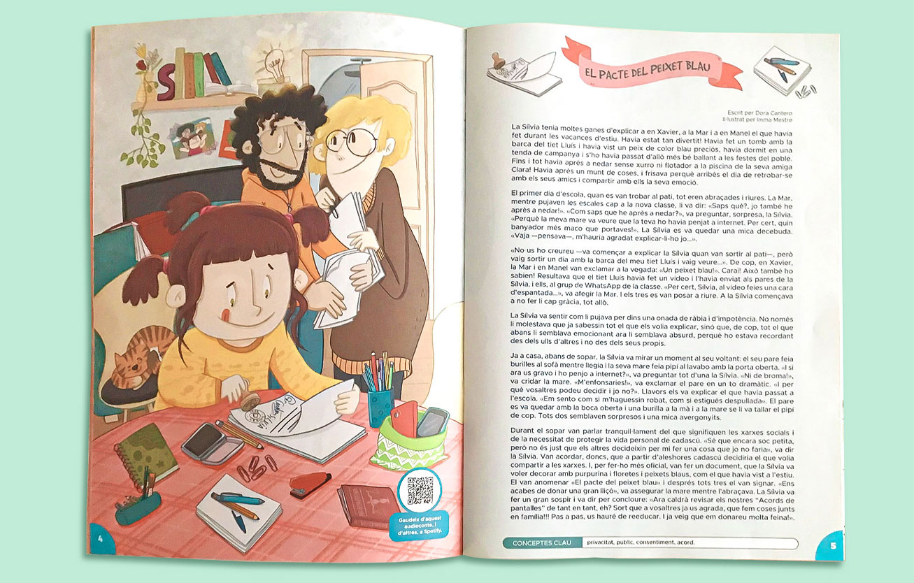 Il·lustracions pel conte que obre el número 41 de la revista infantil Namaka, la revista sense tabús per a la canalla. Aquest número parla sobre les pantalles i l’ús que en fem d’elles, però també de seguretat, consciència i respecte. D’aquest últims aspectes parla el conte escrit per la Dora Cantero que he il·lustrat: la Sílvia, una nena que, cansada que els seus pares publiquin fotos d’ella sense el seu permís a les xarxes socials, signa un pacte amb ells.